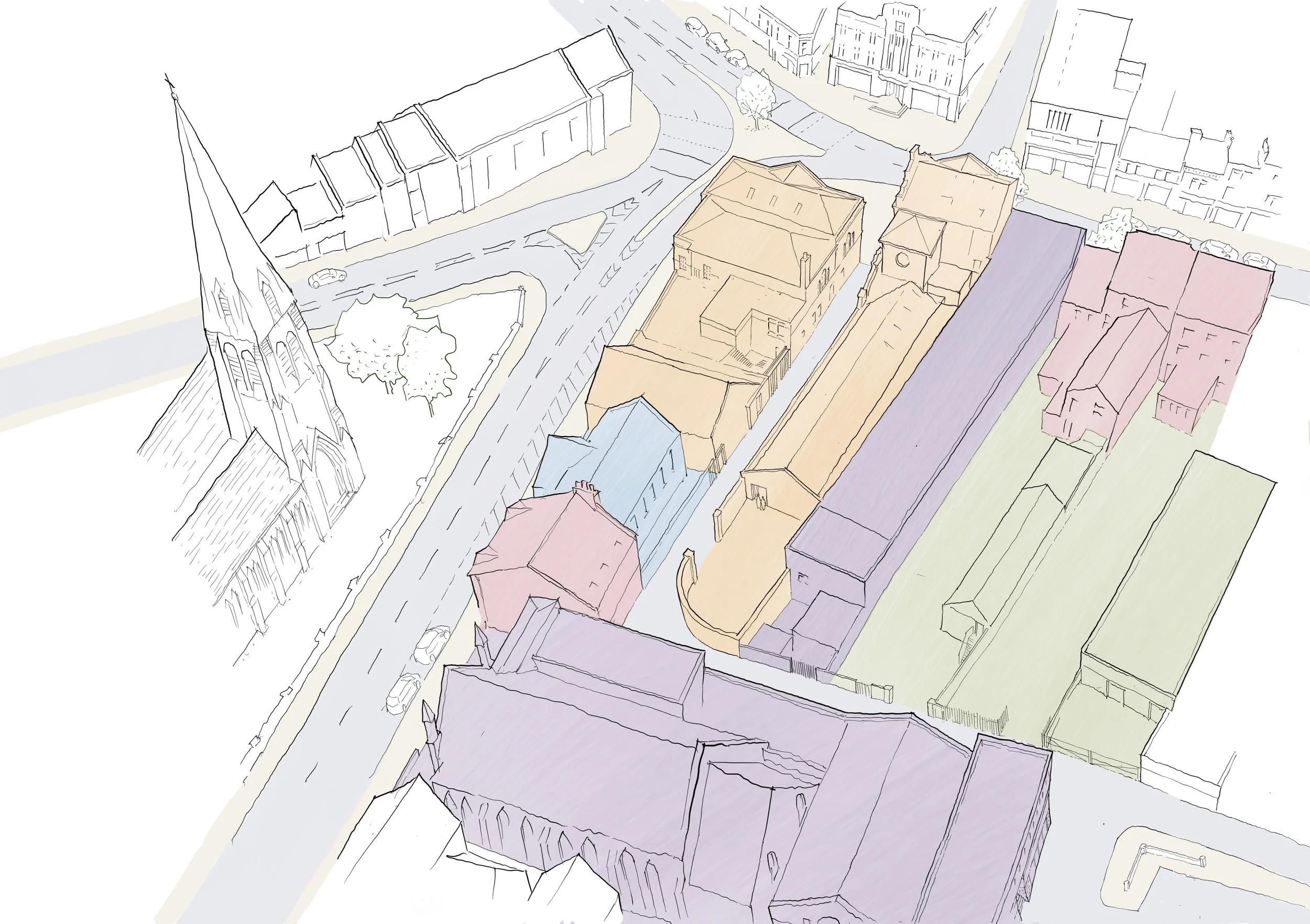 Working with Ards & North Down Borough Council and local partners, OGU Architects developed a strategic vision to re-energise Bingham Lane — a historic but underused laneway linking Market Square with Bangor’s emerging cultural quarter. The study combined historical research, on-site analysis, and engagement with artists, traders, and community groups to reveal how heritage buildings and creative organisations could work together to form a connected and vibrant cultural corridor.
