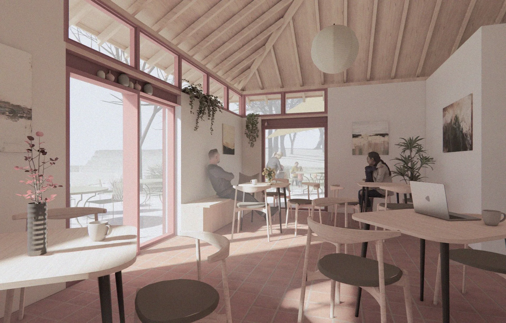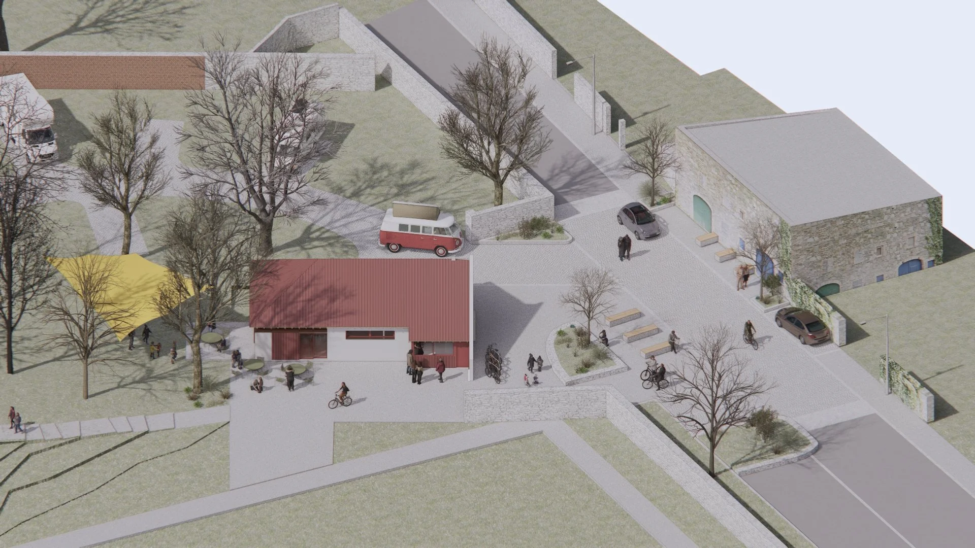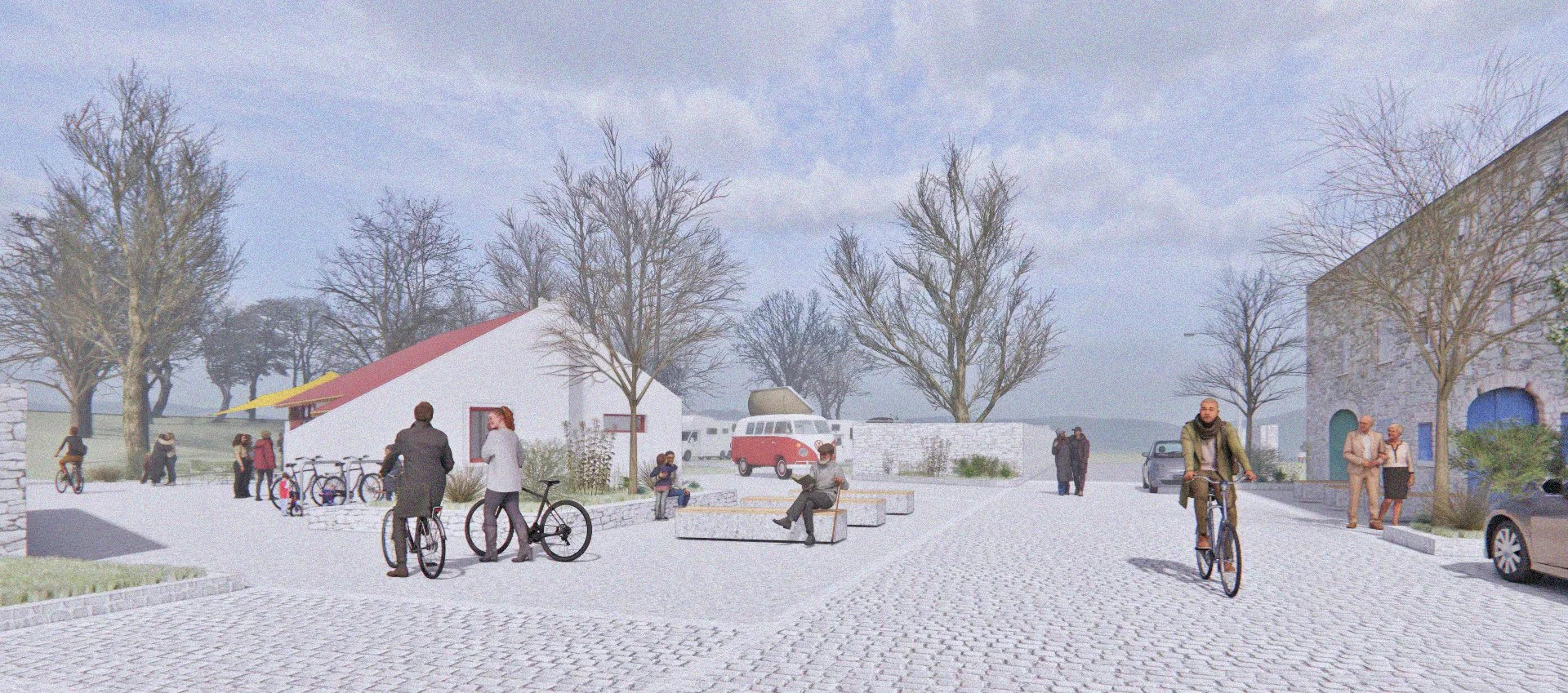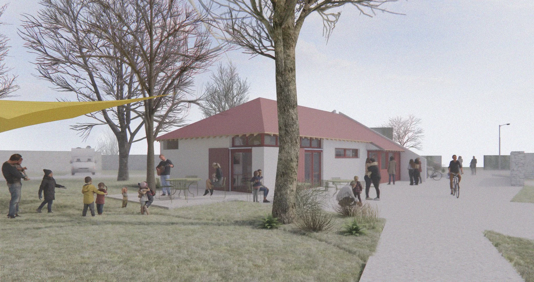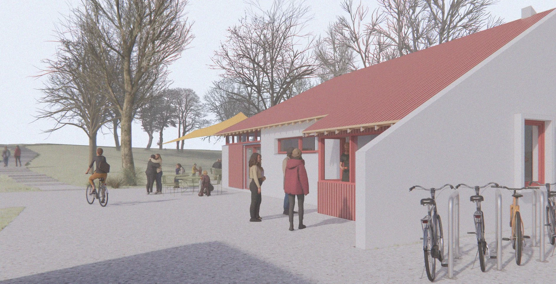 The first phase focuses on transforming the disused entrance building into a community hub — a café, meeting room, and visitor facility that provides essential amenities while creating a visible, welcoming gateway to the park. Designed for flexibility and sustainability, the hub offers showers, laundry, and accessible toilets alongside spaces for community gatherings and outdoor learning, supporting both local residents and visitors arriving via the ferry and coastal walking routes.